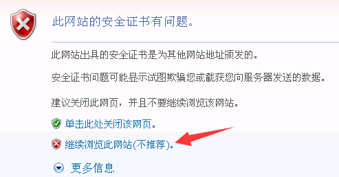 IE6、IE7和IE8浏览器,由于版本过旧,不支持https访问,会出现提示“此网站的安全证书有问题”,但也可点击“继续浏览”。