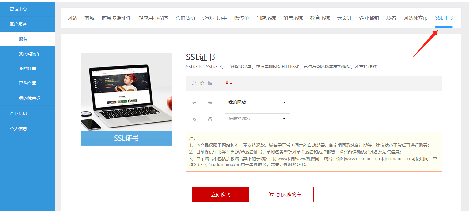 本文主要指引在平台购买证书,在平台购买可实现自动化部署,实现域名https更便捷