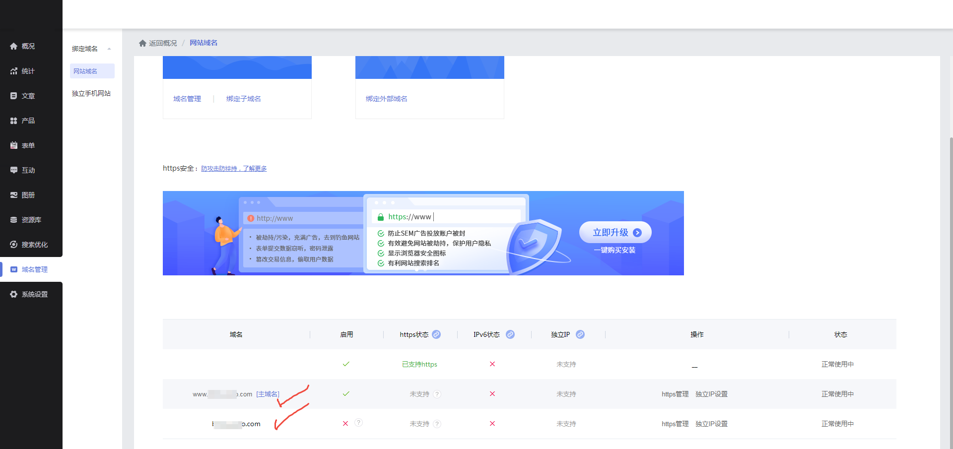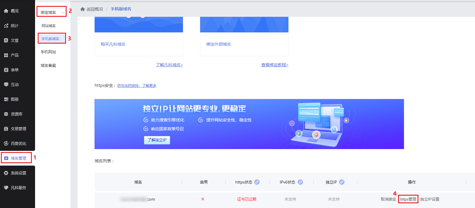 A:手机版域名在【网站域名-绑定域名-手机版域名】中找到购买了SSL证书的域名,点击域名右侧的【https管理】。