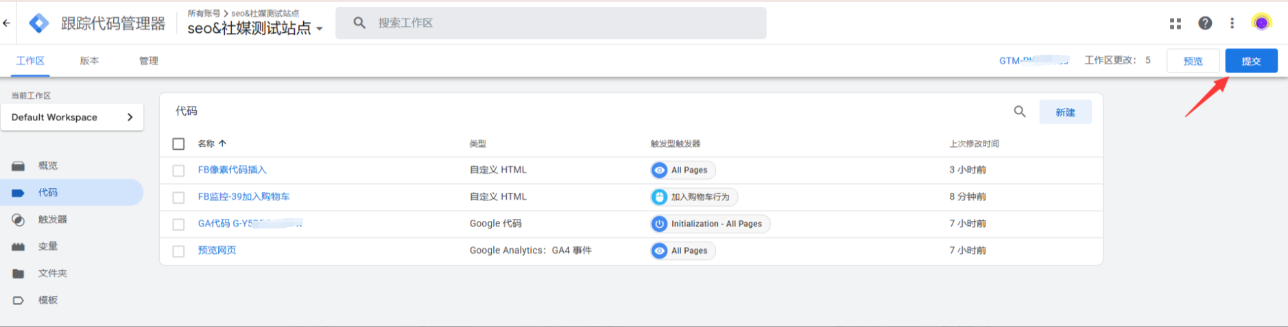 将复制的pixel基代码粘贴到此处,触发条件先选择一个测试用的默认gtm事件(All pages网页预览,比较好触发),点击右上角保存按钮: