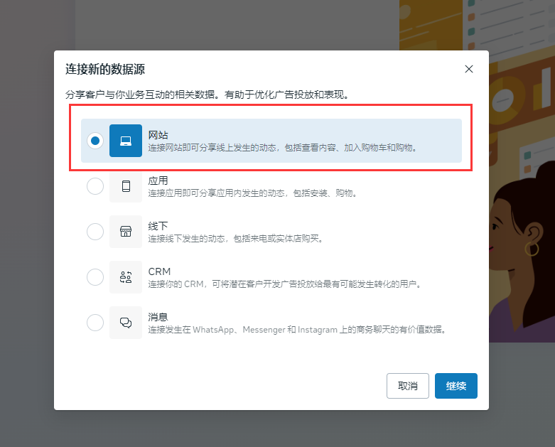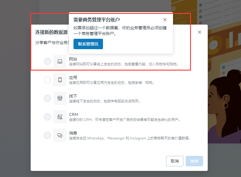 P.S. 如您的账号无法选择网站类型的数据源,并提示需要商务管理平台账户,如下: