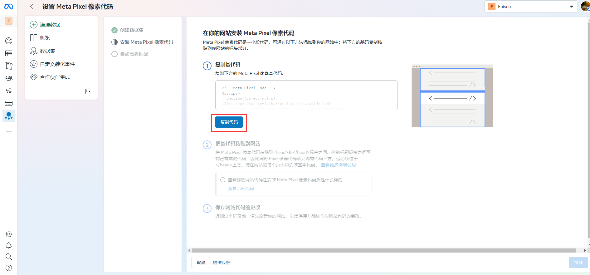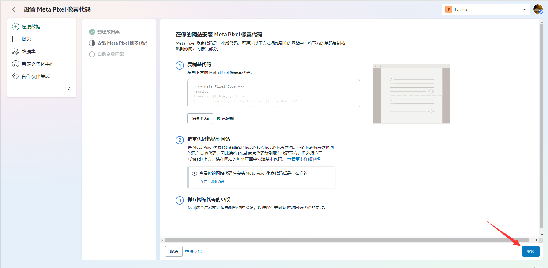 发布成功后,回到meta平台设置像素代码界面,点击右下角“继续”按钮:
