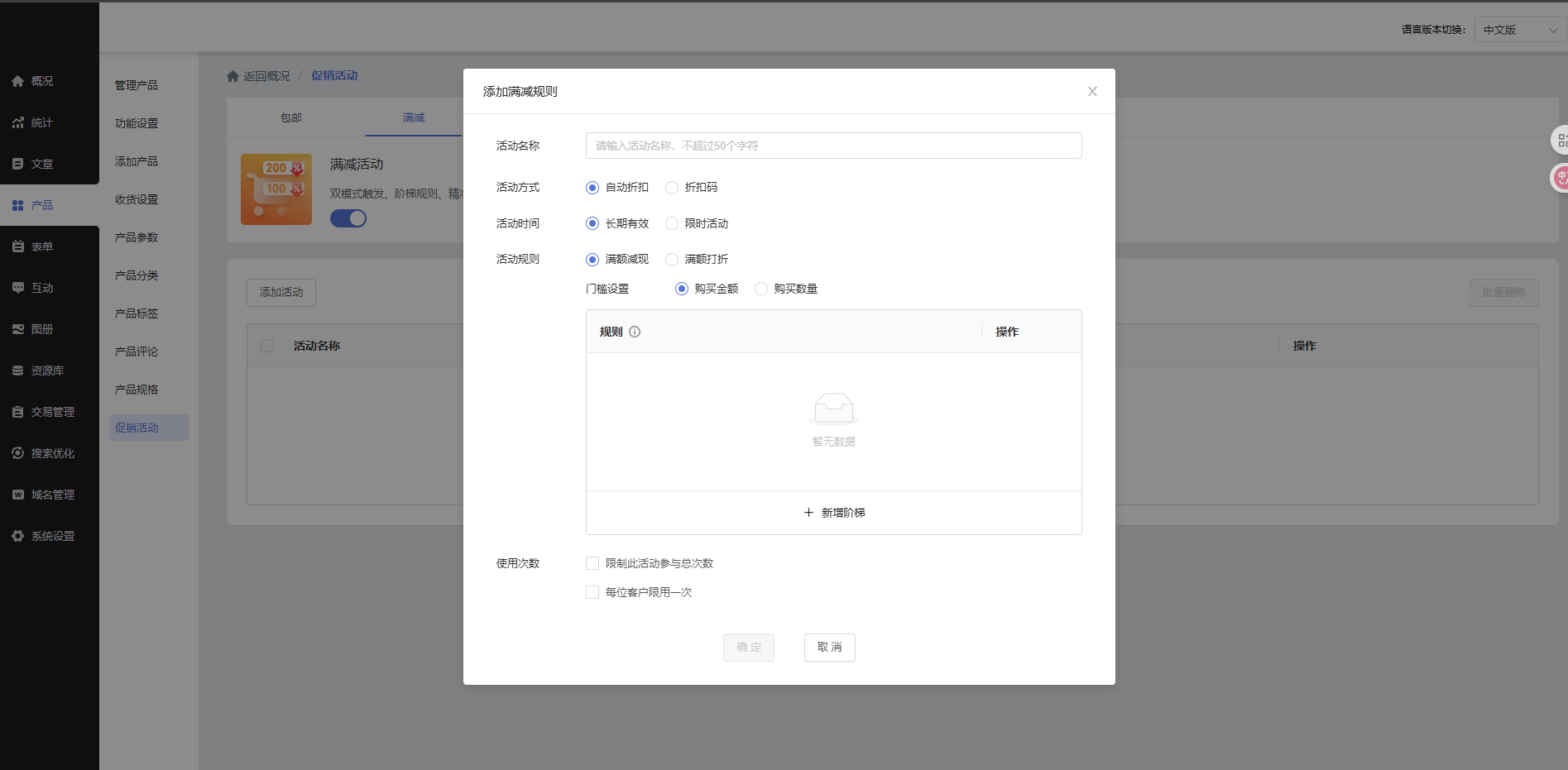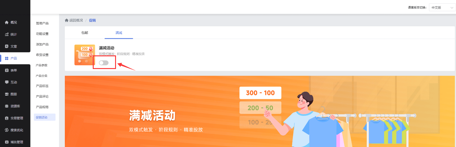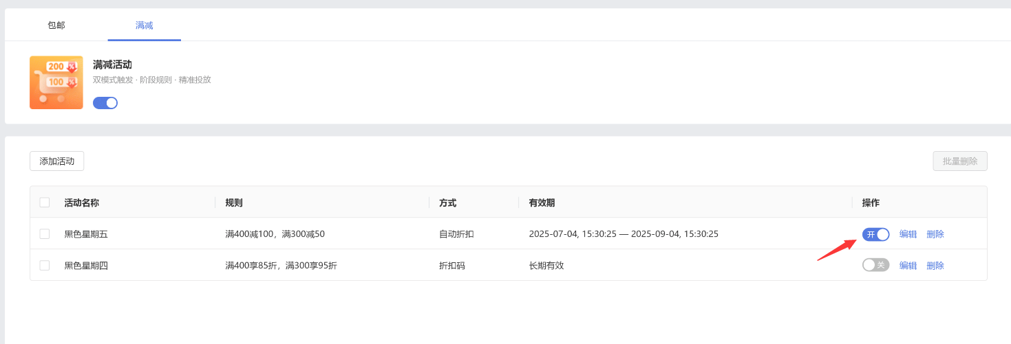 登录管理后台,在产品-促销活动中,开启满减活动功能: