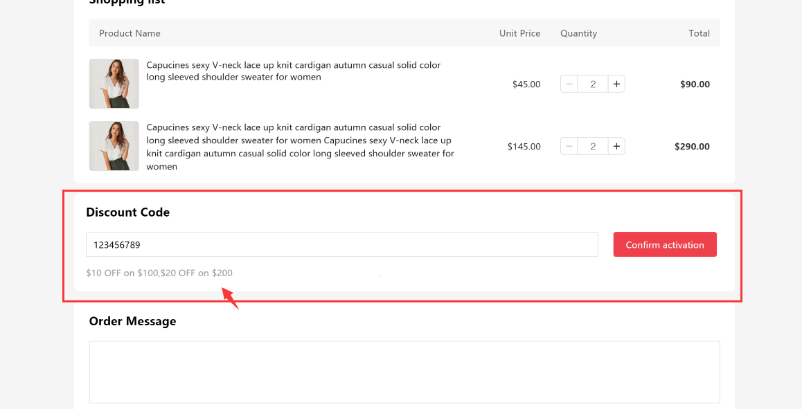折扣码的兑换入口在下单前,消费者复制折扣码在此处,可以进行优惠权限的兑换。